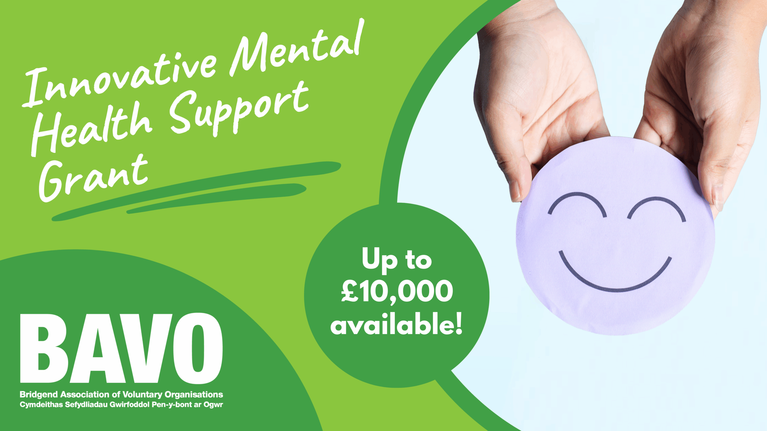 BAVO are offering grants of £7,000–£10,000 for innovative, small-scale projects that respond to identified, unmet mental health support needs among residents of Bridgend County Borough. This opportunity aims to support creative, community-based, or partnership approaches that test new ways of supporting mental wellbeing.