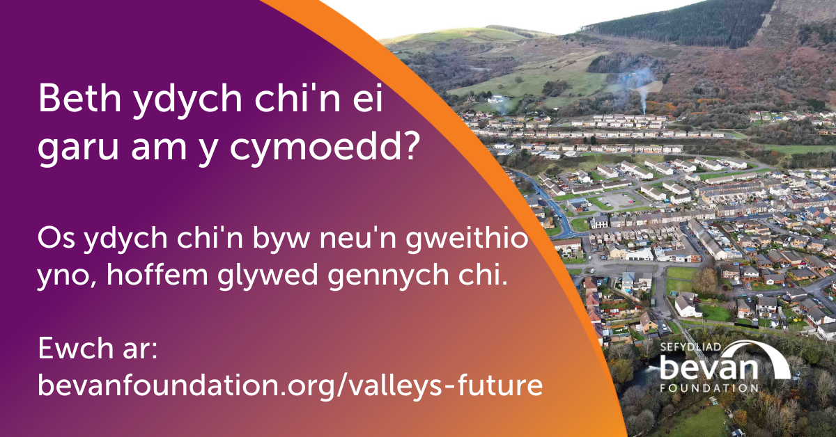 Fel rhan o Bevan Foundation Project Bevan i adeiladu gwytnwch economaidd lleol yng nghymoedd De Cymru, maen nhw’n gwahodd preswylwyr a gweithwyr yng nghymoedd de Cymru i rannu’r hyn maen nhw’n ei garu am yr ardal a beth allai ei gwneud hi’n well fyth.
